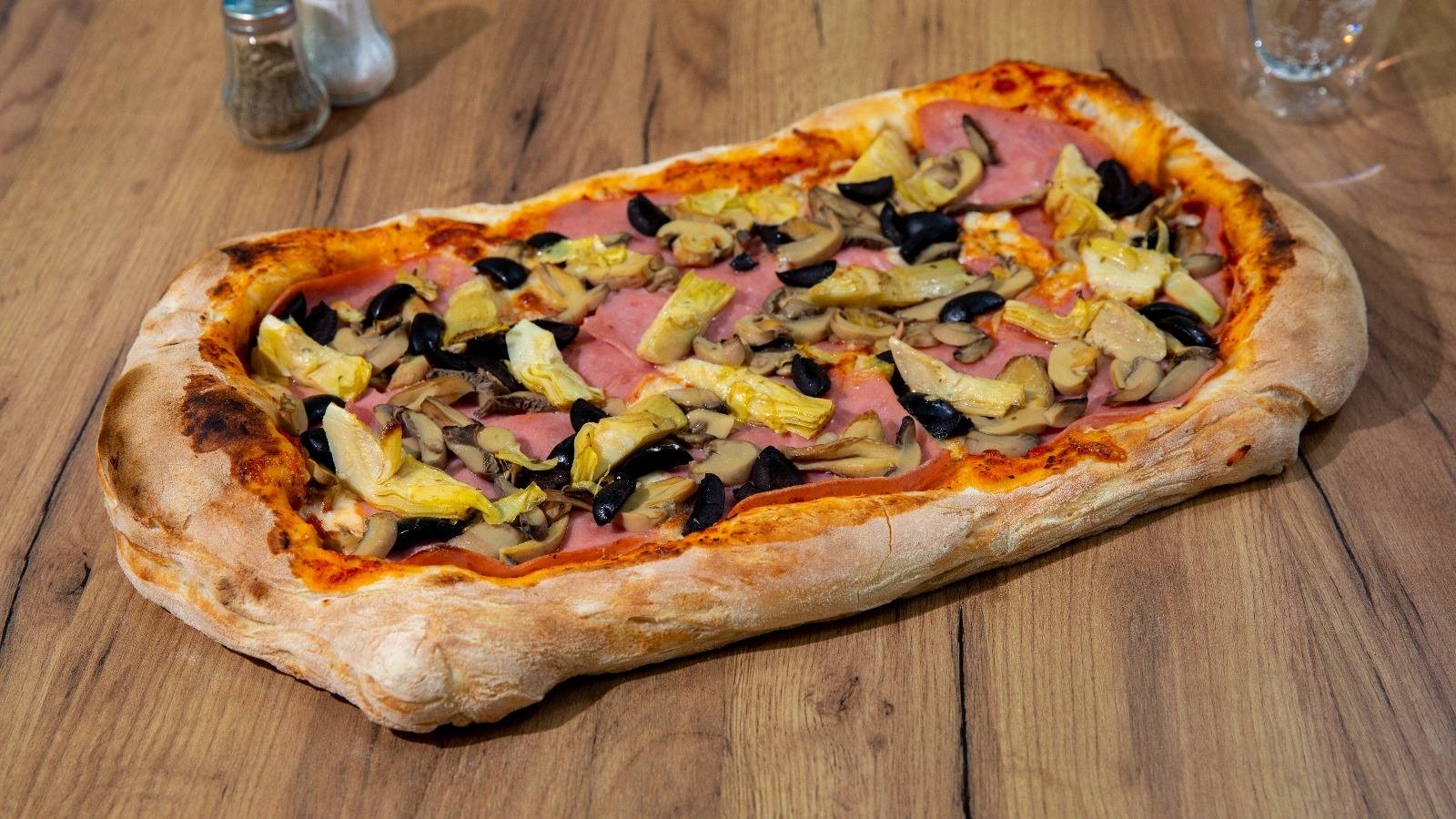 Blat, sos de roșii, mozzarella, șuncă porc, ciuperci, anghinare, măsline - 1.4kg -