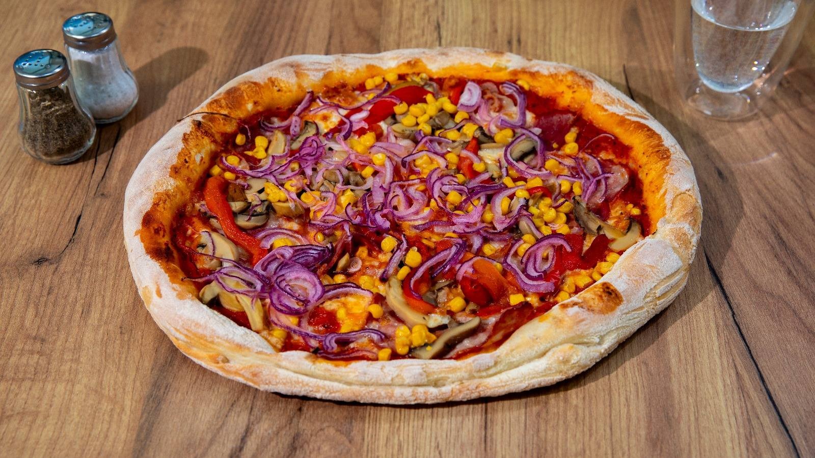 Blat, sos de roșii, mozzarella, bacon, ciuperci, ardei, porumb, ceapă roșie - 1.5kg -