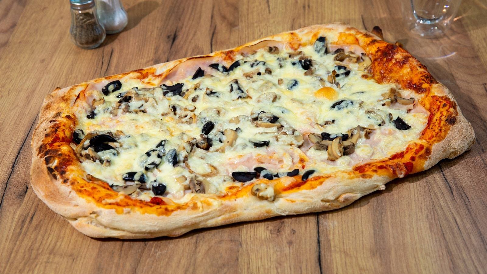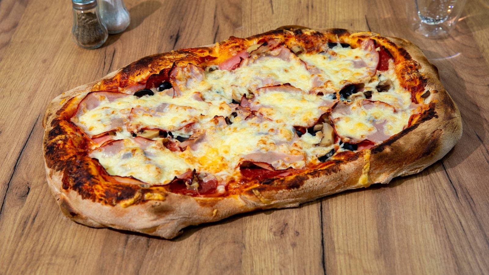 Blat, sos de roșii, mozzarella, șuncă porc, ciuperci, măsline, salam, salam picant, mușchiuleț, cașcaval - 1.6kg -