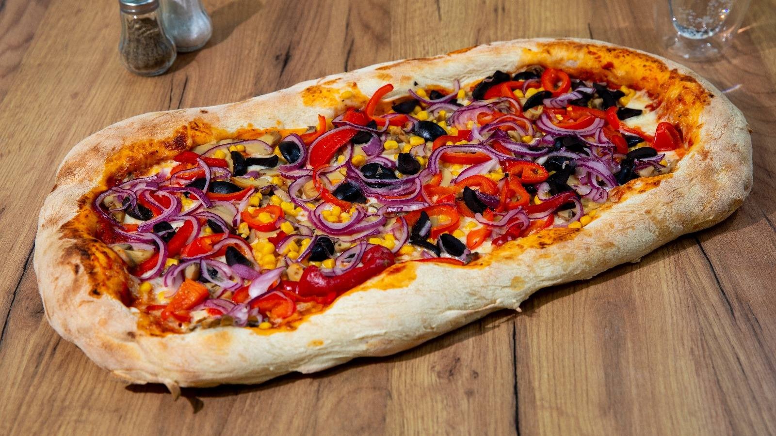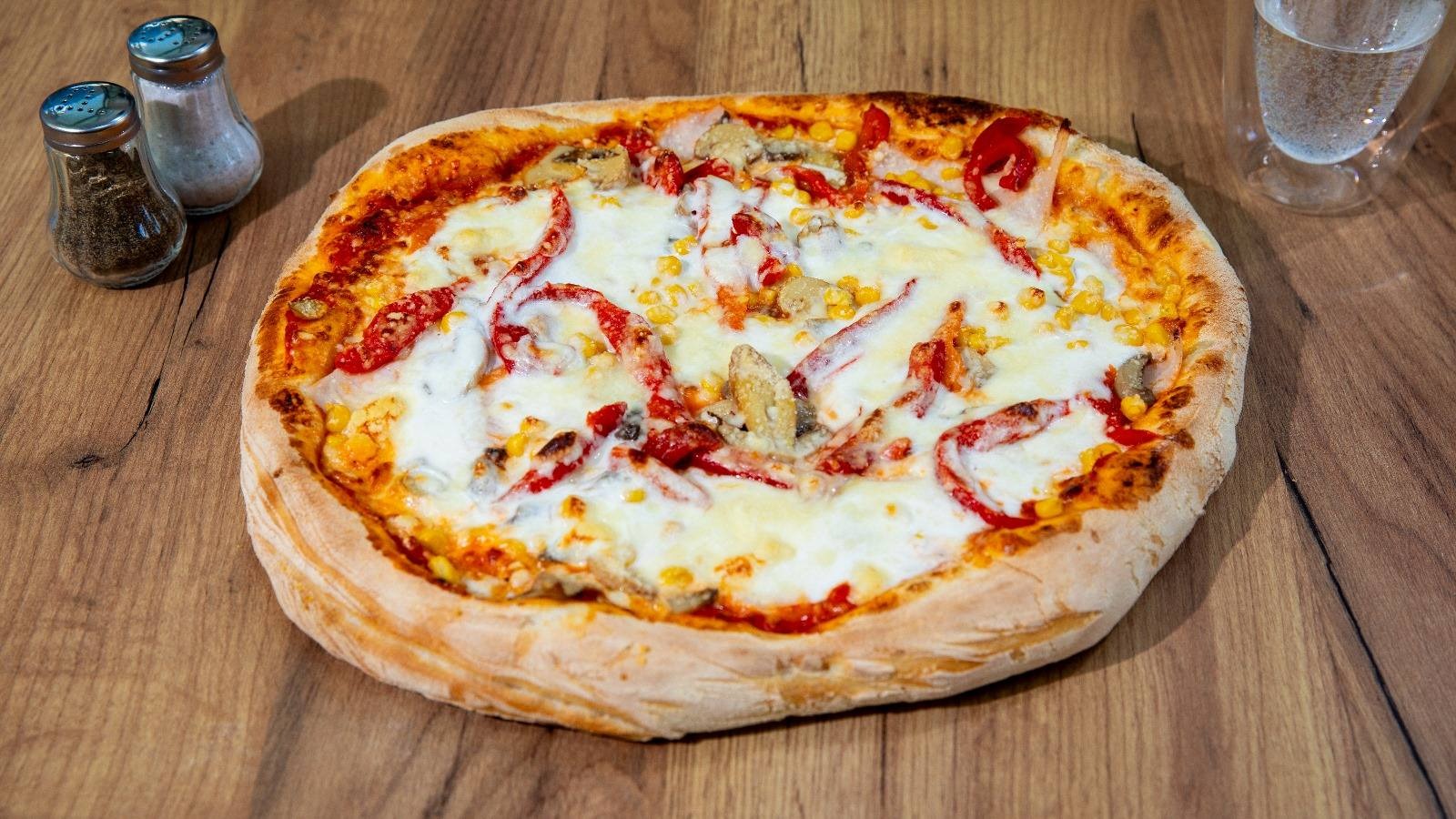 Blat, sos de roșii, mozzarella, ciuperci, măsline, porumb, ardei, ceapă - 1.4kg -